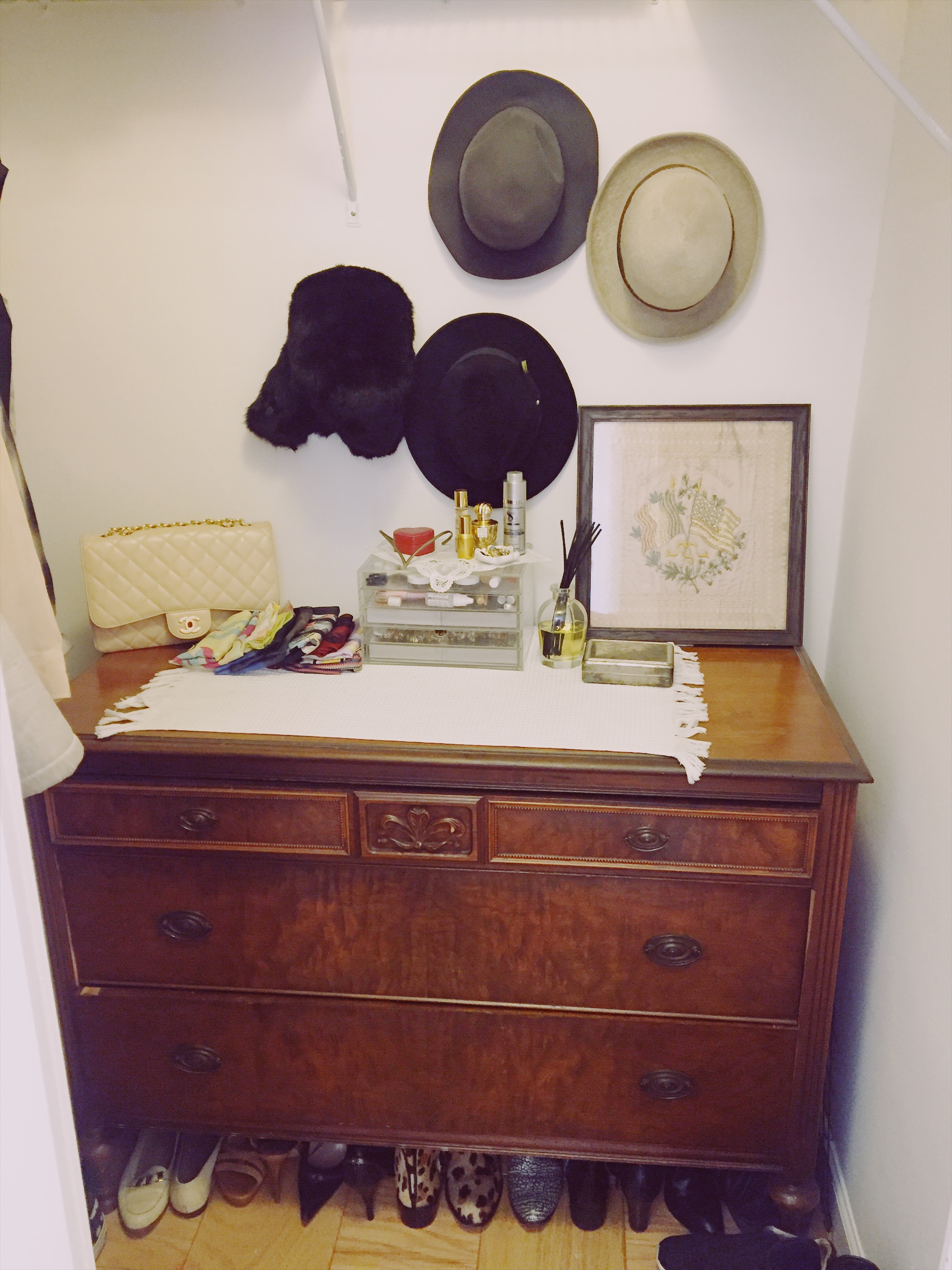 If you can’t tell, yes, this is a walk in closet. Unheard of in a small NYC apartment. The irony? I didn’t need it! Previously living in the SRO with absolutely ZERO storage space, had turned me on to minimalism. All the things I didn’t love, quickly became big eyesores when I had to stare at them everyday in such a small space. I got rid of about 70% of my things. They represented a different time in my life, college and post college jobs (most in retail), lots of super high heels when I drove and did very little walking, and a lot of mismatched clothing items when I hadn’t yet found my style. The extra space in my studio allowed for me to put my dresser in the closet and have a space I could make into a mini dressing room.